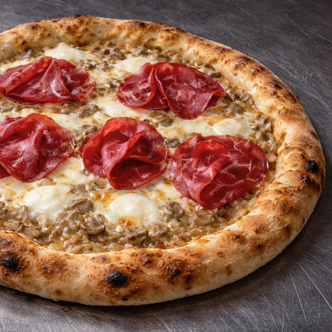 Our pizza bakes with fior di latte mozzarella and a generous layer of creamy, aromatic 100% porcini mushrooms. Once out of the oven, it’s finished with delicate slices of Italian bresaola, added raw to preserve its tenderness and depth.